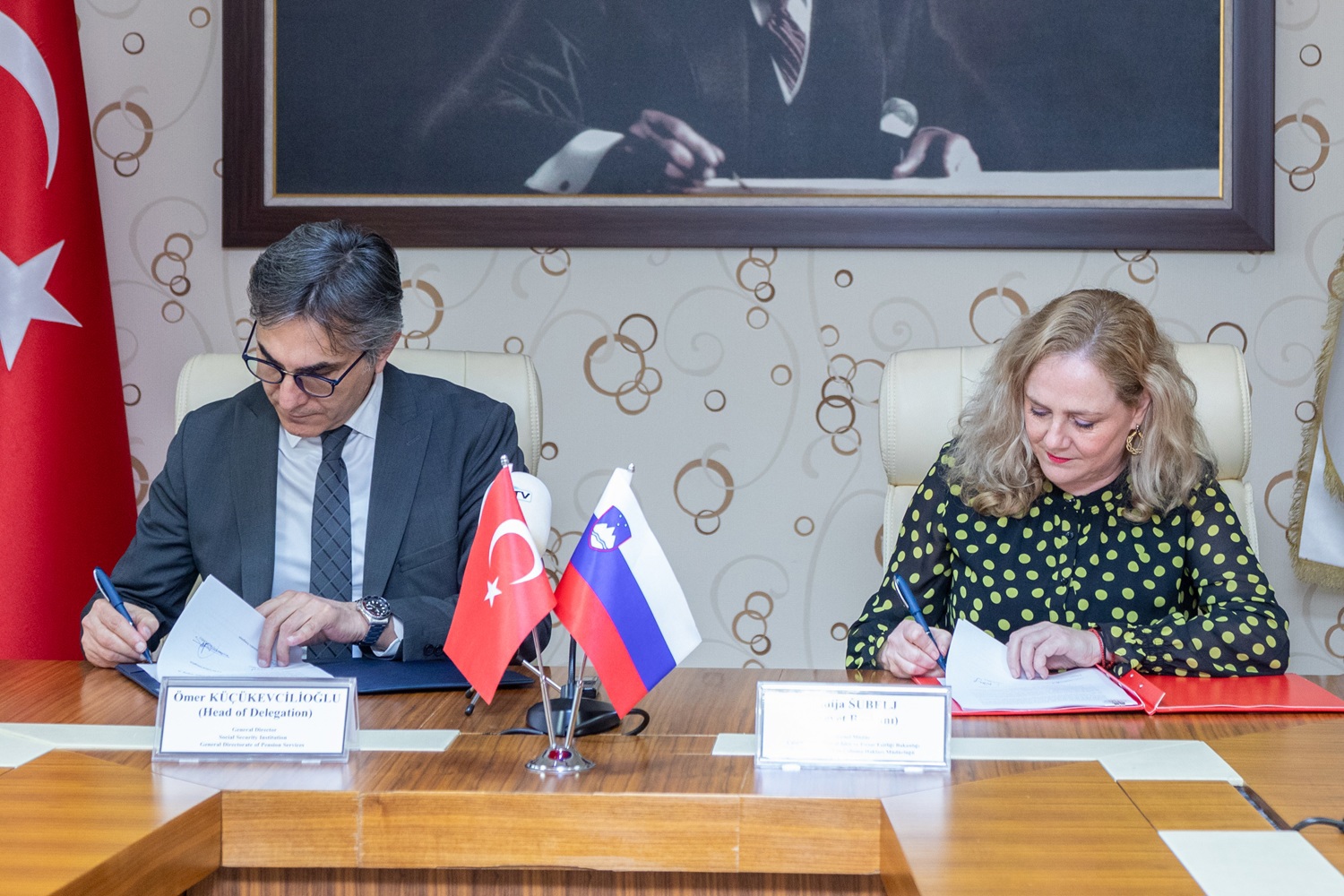 Emeklilik Hizmetleri Genel Müdürlüğü Erkan Özkan Toplantı Salonu’nda gerçekleşen görüşmelere, Emeklilik Hizmetleri Genel Müdürü Ömer Küçükevcilioğlu, Genel Müdür Yardımcısı Necmettin Öz, Yurtdışı Sözleşmeler ve Emeklilik Daire Başkanı Ramazan Elma, Çalışma ve Sosyal Güvenlik Bakanlığı Anlaşmalar Daire Başkanı Uğur Emre Bektaş, Slovenya Çalışma, Aile, Sosyal İşler ve Fırsat Eşitliği Bakanlığından Çalışma İlişkileri ve Çalışma Hakları Müdürlüğü Genel Müdürü Lidija Šubelj ve beraberindeki heyet katıldı.